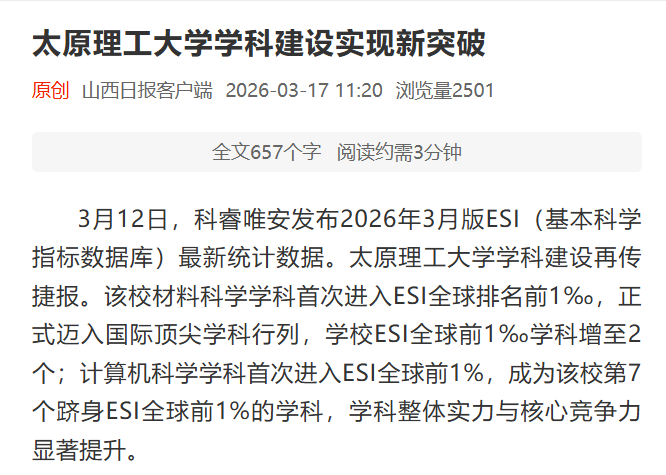 3月12日,科睿唯安发布2026年3月版ESI(基本科学指标数据库)最新统计数据。太原理工大学学科建设再传捷报。该校材料科学学科...