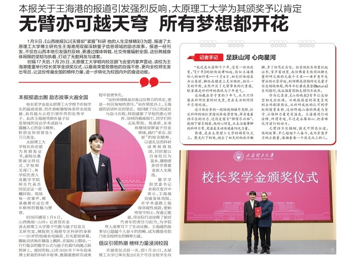 原文:1月9日,《山西晚报》以《无臂却“紧握”科研他的人生足够精彩》为题,报道了太原理工大学博士研究生王海港用双脚深耕...