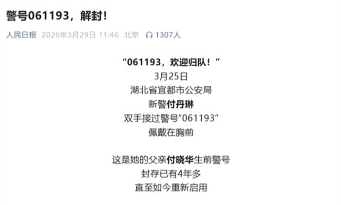 原文:“061193,欢迎归队!”3月25日湖北省宜都市公安局新警付丹琳双手接过警号“061193”佩戴在胸前这是她的父亲付晓华生前...