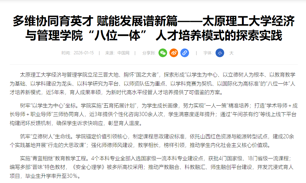 原文:太原理工大学经济与管理学院立足三晋大地、胸怀“国之大者”,探索形成“以学生为中心、以立德树人为根本、以教育教学...