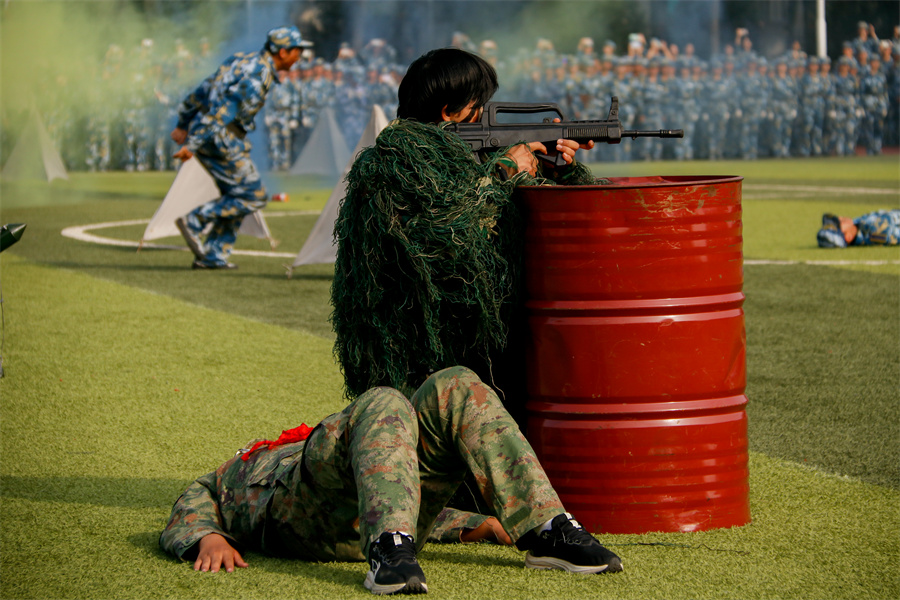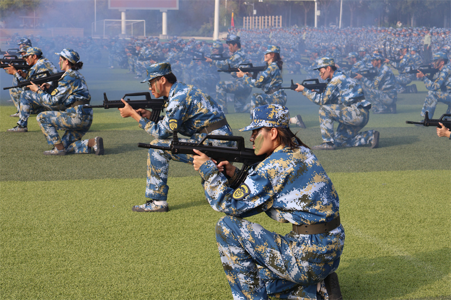 伴随着激昂的旋律,汇报表演率先以分列式拉开序幕。整齐有序的分列式方阵移动间尽显纪律之美;紧接着,匕首操、擒敌拳、应急棍术依次亮相,气势恢宏的表演让观众掌声不绝。战术综合演练环节,同学们动作娴熟流畅,嘹亮口号与整齐动作交织,气宇轩昂的姿态感染了在场每一个人。这不仅是军训成果的展示,更是太理学子精神风貌的生动写照。当最后一个演练动作完成,现场瞬间爆发出热烈掌声,欢呼声与掌声交织,将汇报氛围推向高潮。