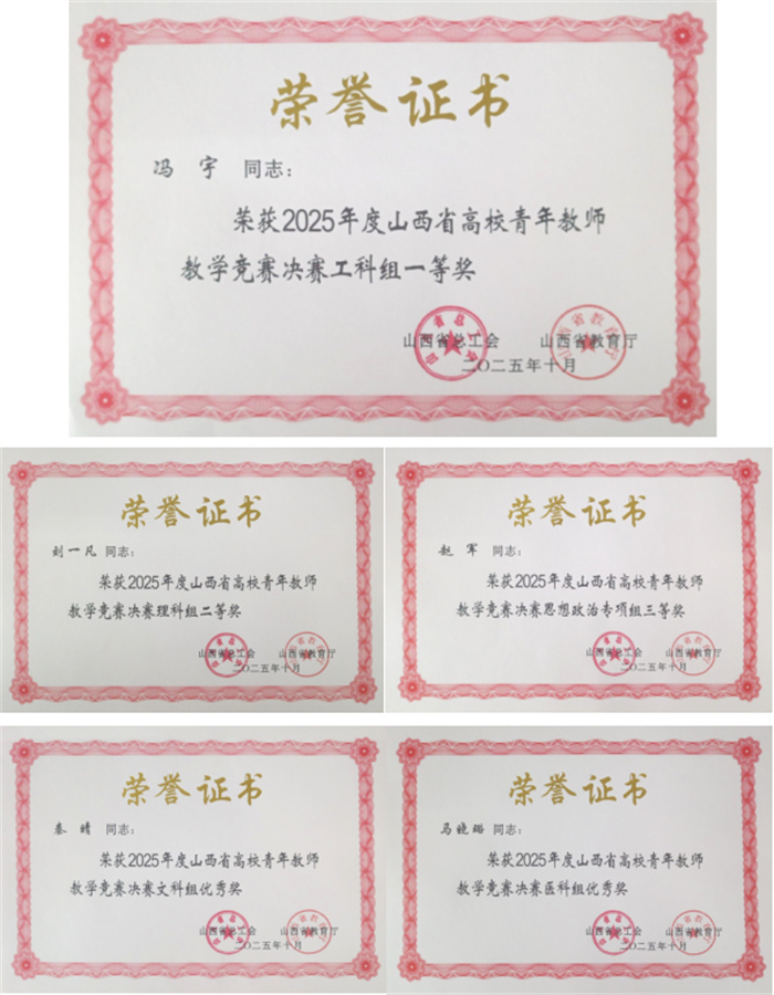 近日,由山西省总工会、山西省教育厅联合主办的2025年度山西省高校青年教师教学竞赛决赛在山西大学举办。我校选派五位教师参赛,获一等奖1项、二等奖1项、三等奖1项、优秀奖2项,学校荣获优秀组织奖。