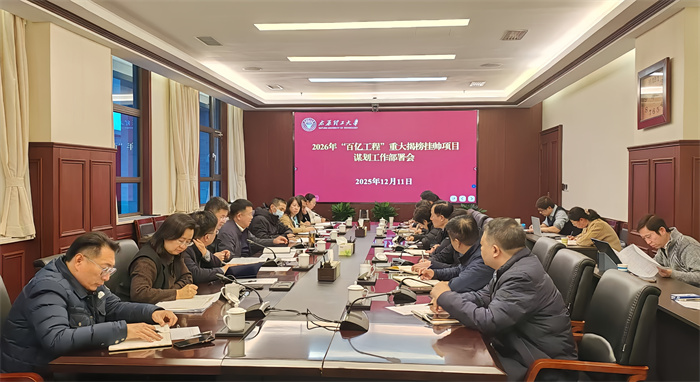 2026年是“十五五”规划开局之年。为深入推进新一轮“百亿工程”实施,紧密围绕高质量发展核心目标,力争形成若干重大标志性成果,12月11日下午,学校在明向校区行政南楼A312会议室组织召开2026年“百亿工程”重大揭榜挂帅项目谋划工作部署会。校党委书记沈兴全、副校长桑胜波出席会议。学校发展改革部等16个部门负责人参加会议。