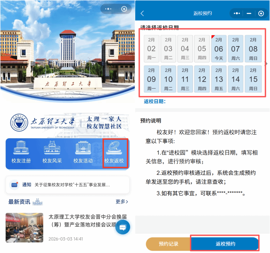 2.目前小程序在试运行阶段,若校友在注册、校友卡申领以及预约返校过程中遇到问题,可致电校友工作办公室(电话:0351-3176628)。