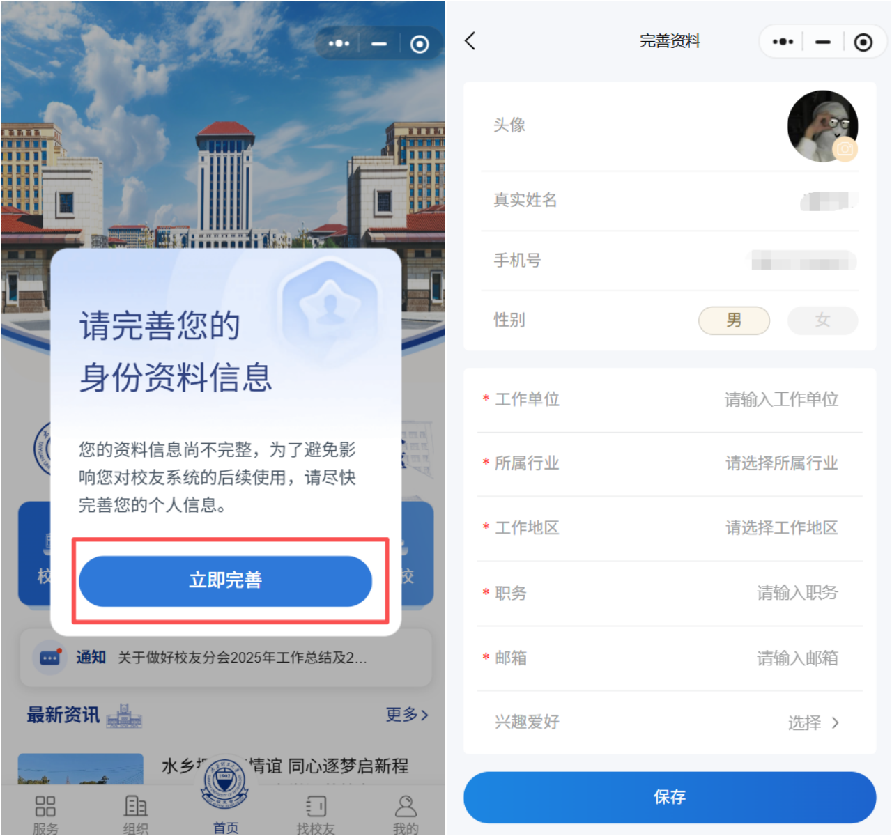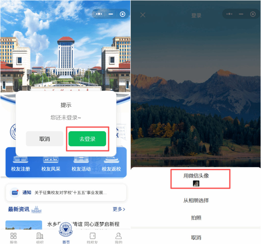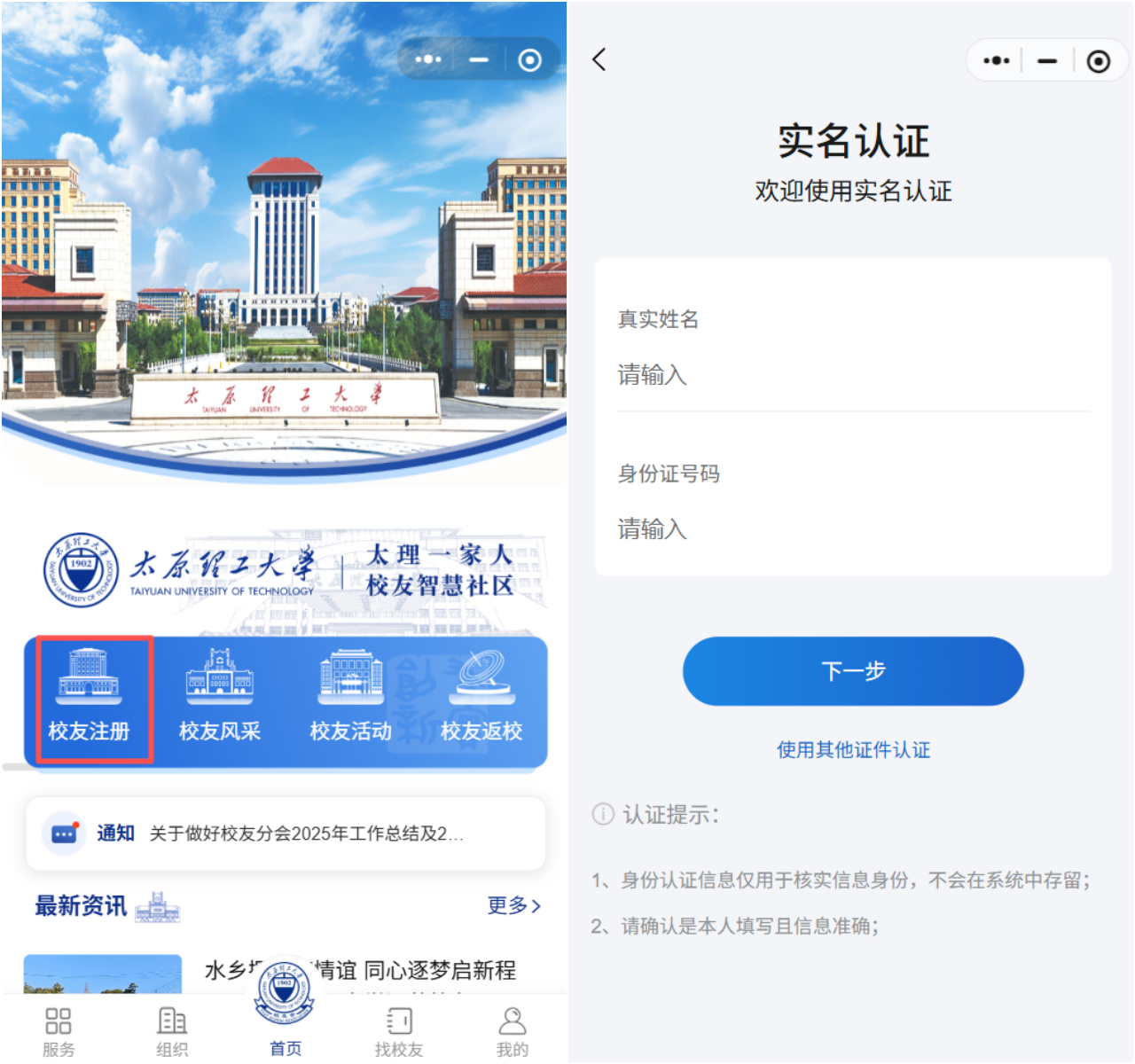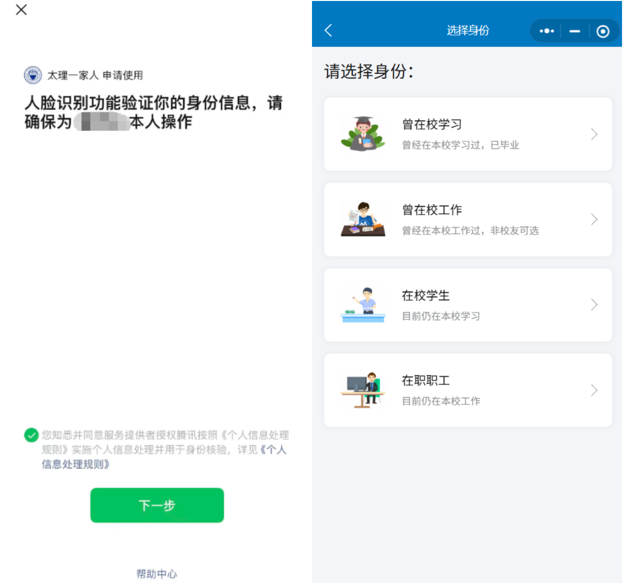 进入小程序首页,点击首页,校友注册。填写本人持有的身份证号码,进入人脸识别认证;人脸识别成功后,选择个人身份“曾在校学习”、“曾在校工作”、“在校学生”、“在职职工”。