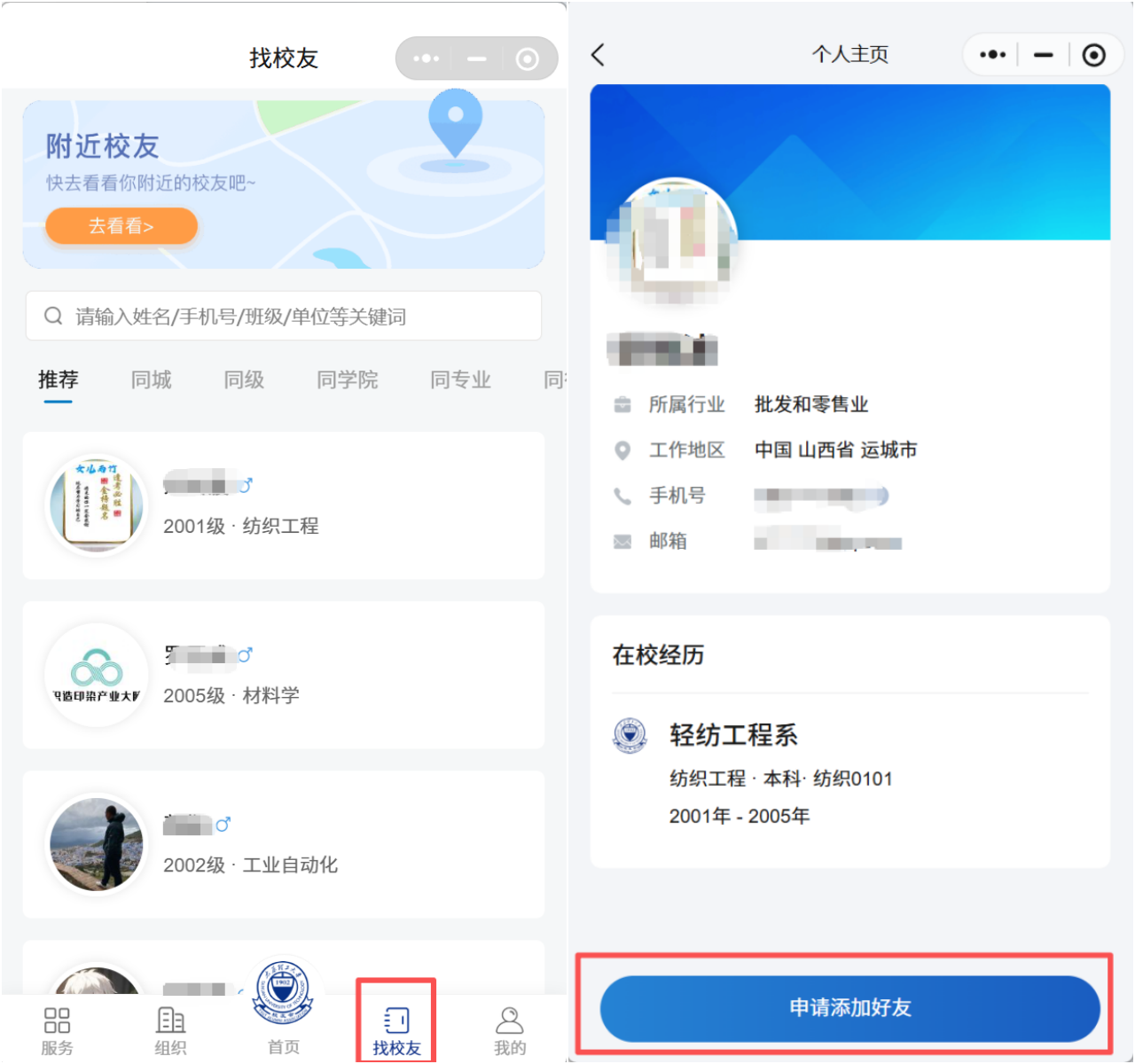 可查找校友、老师,在线互换名片,再续同窗与师生情谊。