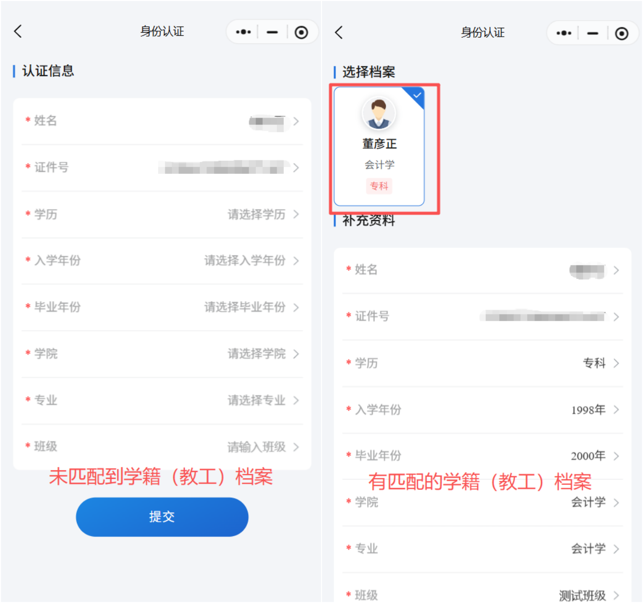 选择相应认证通道后,系统会根据身份证号自动匹配学籍(教工)档案,有匹配的学籍档案时,上方选择档案,下方展示档案信息;若未匹配到学籍档案,需手动填写个人学籍信息,补充证件,提交认证申请,等待后台人工审核。