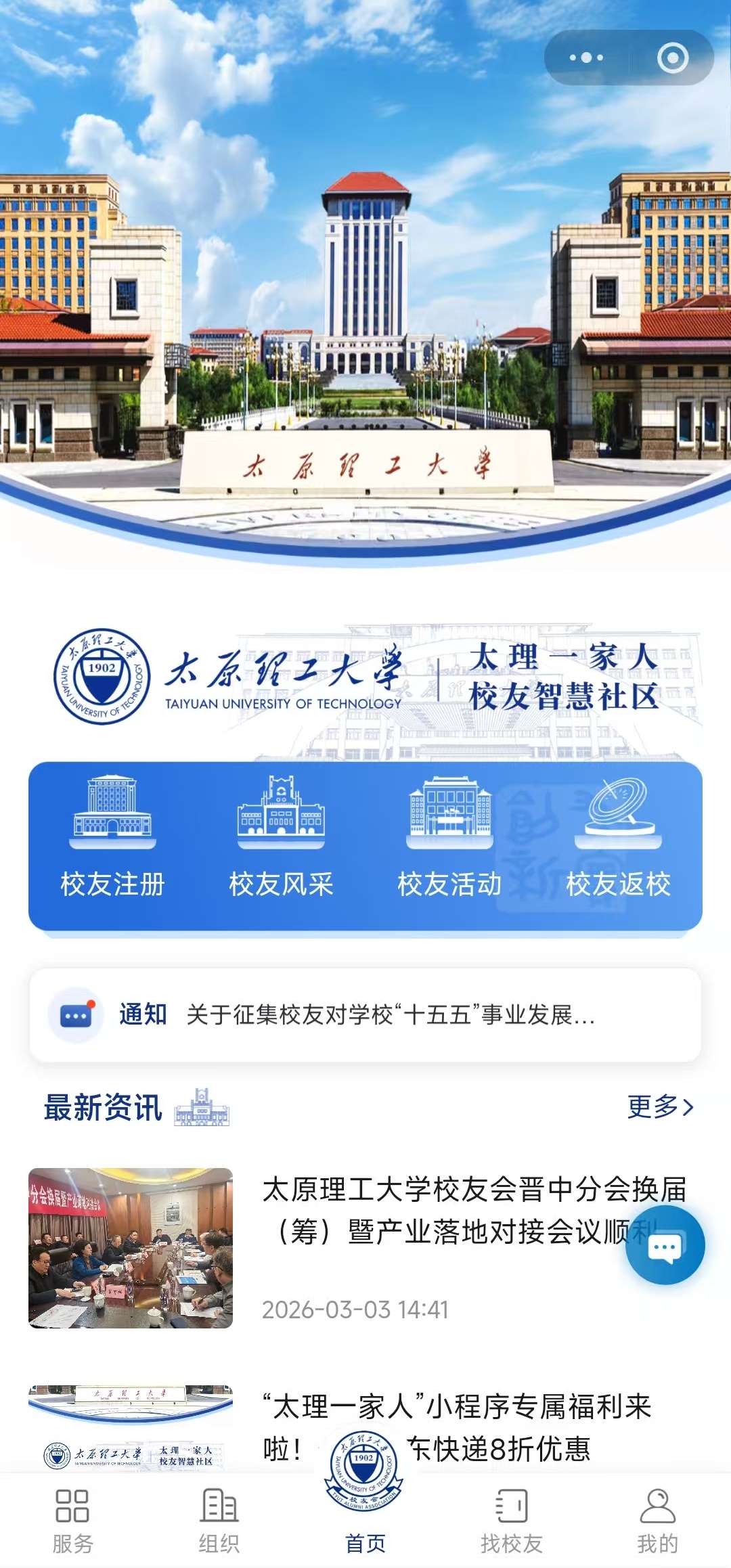 太理同心,情系母校。无论毕业多年,身处何方,母校始终是你最坚实的后盾,校友始终是你最温暖的同行者。“太理一家人”校友智慧社区小程序正式上线试运行!专属“云家园”解锁,一键链接母校与老友。往后岁月,我们并肩同行,共赴新程~