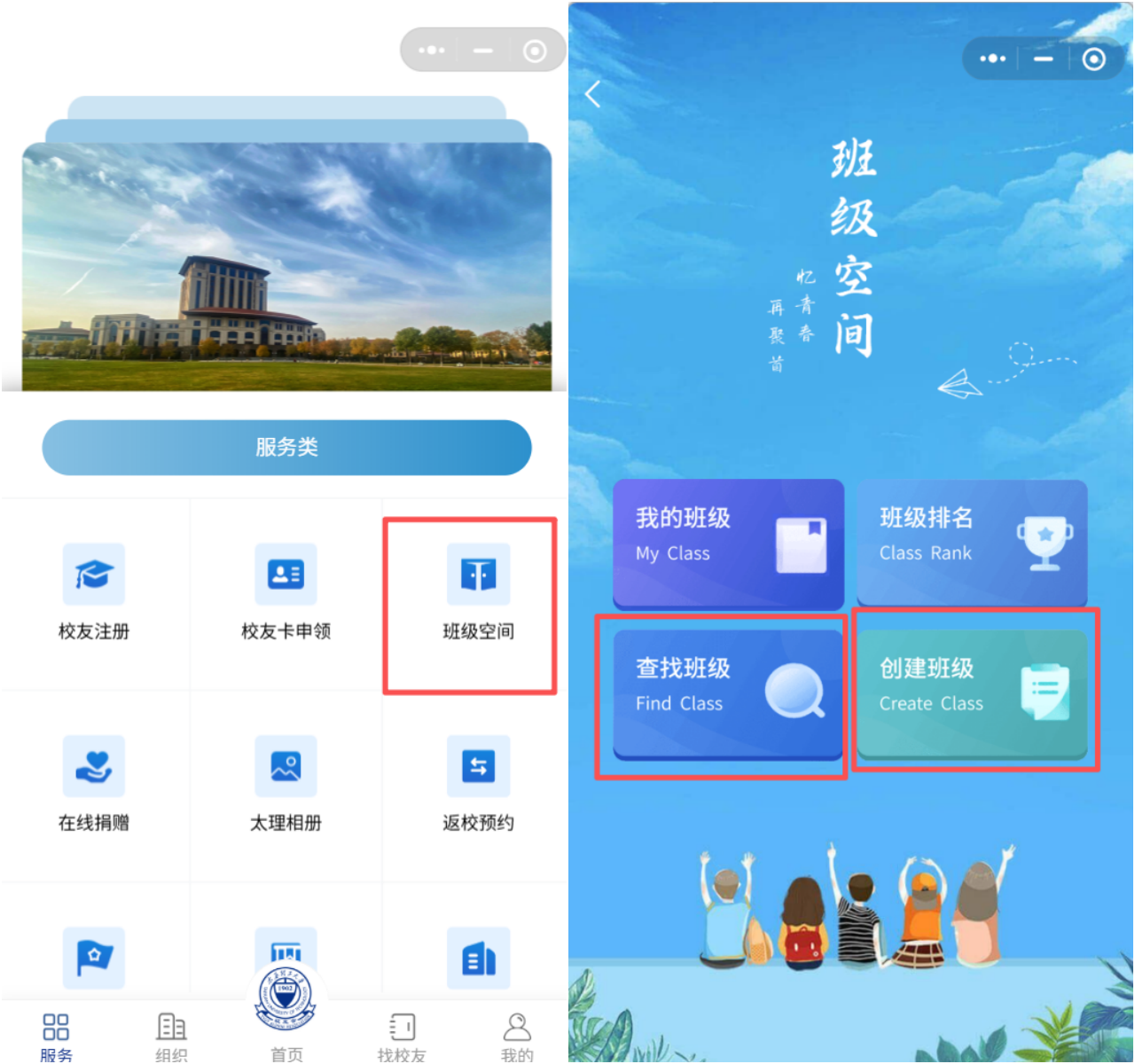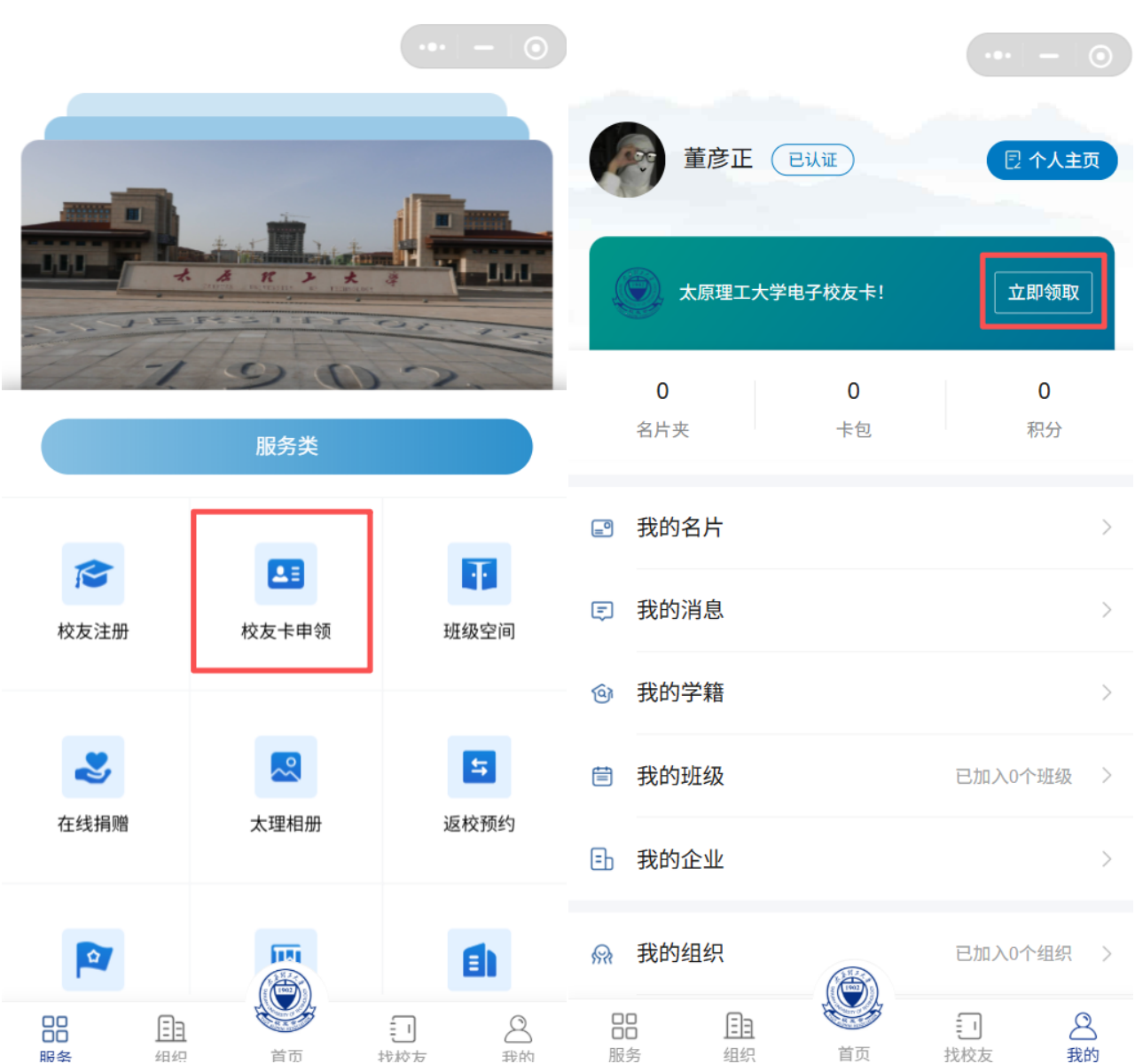 在小程序服务页面点击“校友卡申领”,或我的页面点击“立即领取”,即可领取电子校友卡。