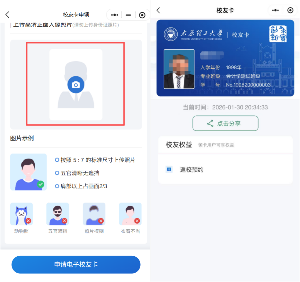 1.校友卡是太原理工大学校友身份的象征,具有纪念意义和服务功能。校友卡各种专属权益将在后期陆续开放,敬请期待。