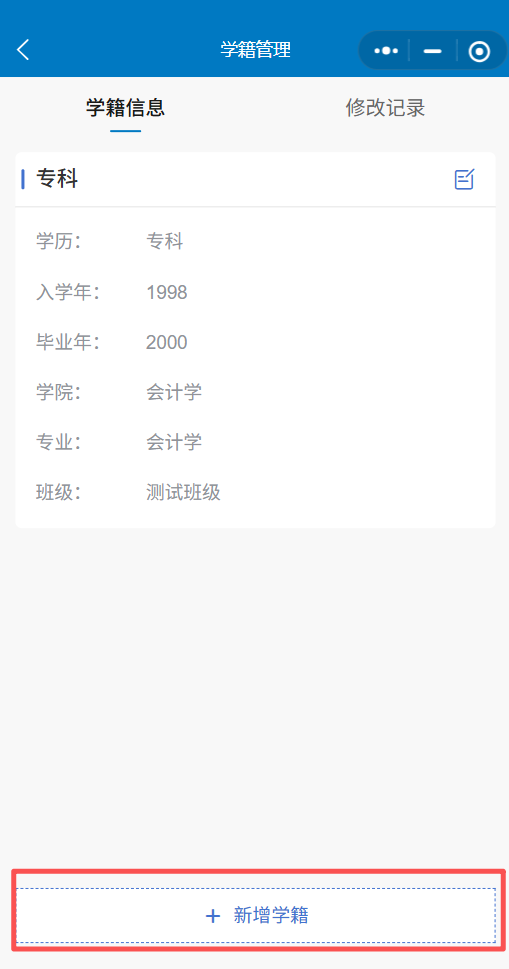 温馨提示:关于在校有多段学习经历的情况,如有未关联到的档案,认证通过后,可以在“我的-我的学籍”中新增学籍进行完善。