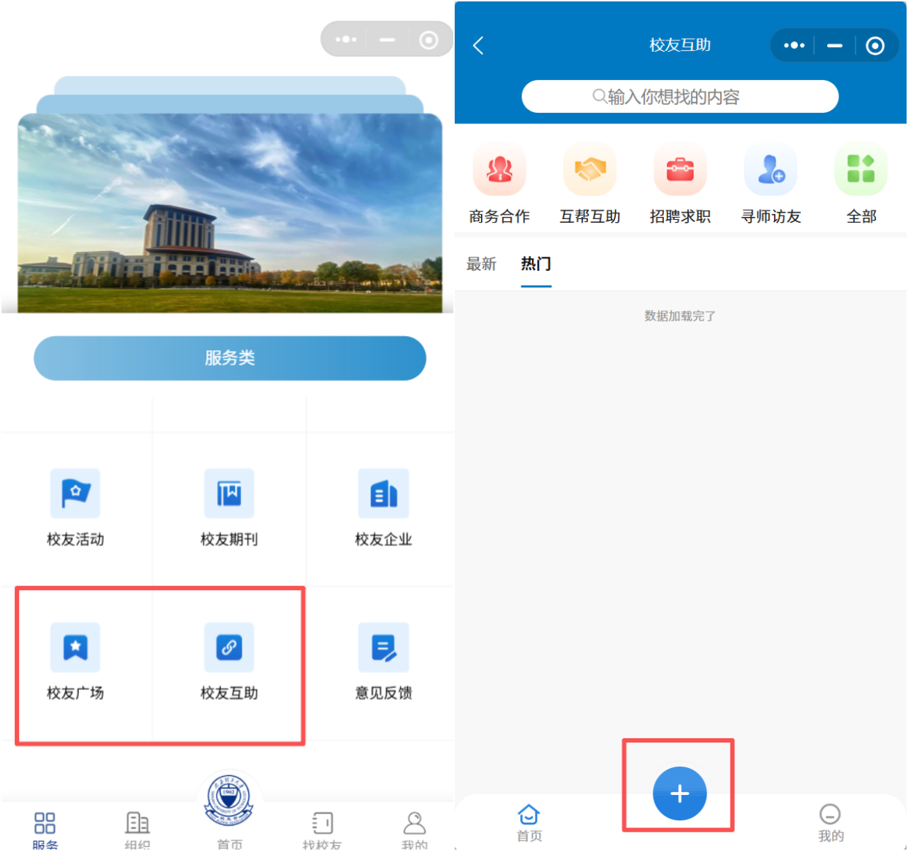可在校友广场自由发言分享,在校友互助板块互帮互助,共享资源、共解难题。