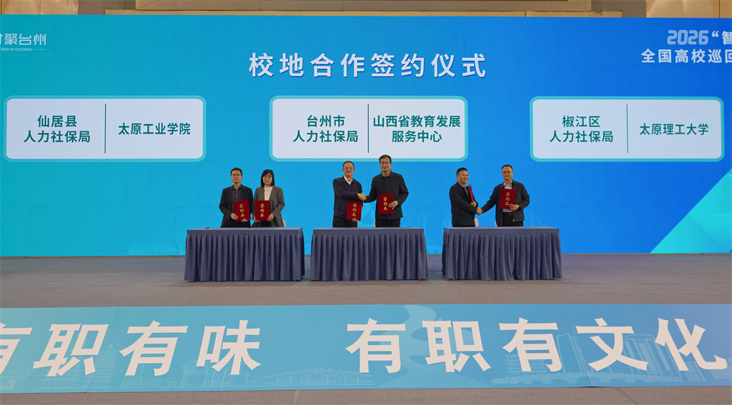 启动仪式上,晋浙两地政校企多方达成合作共识,现场举行集中签约仪式。山西省教育发展服务中心与台州市人社局、太原理工大学与椒江区人社局、太原工业学院与仙居县人社局签署人才合作协议;5所山西高校与台州5家企业完成校企合作签约,开启校地共赢新篇章。