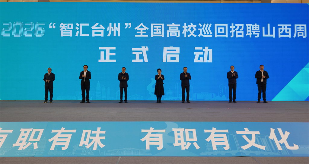 在全场热烈掌声中,杨玲玲、梁宏宇、肖连团等领导共同上台启动2026“智汇台州”全国高校巡回招聘山西周活动,标志着本次引才系列活动正式拉开帷幕。