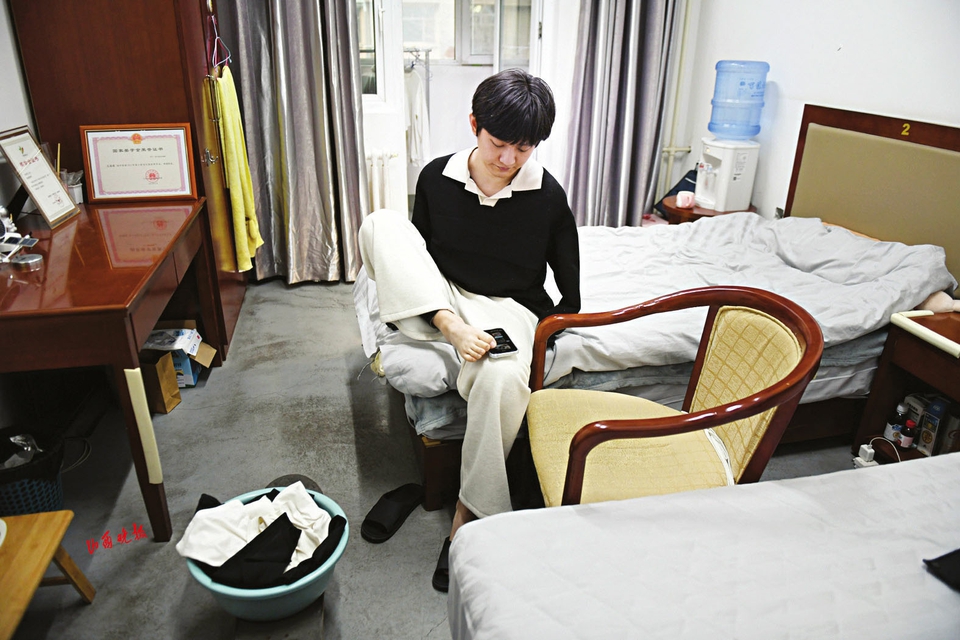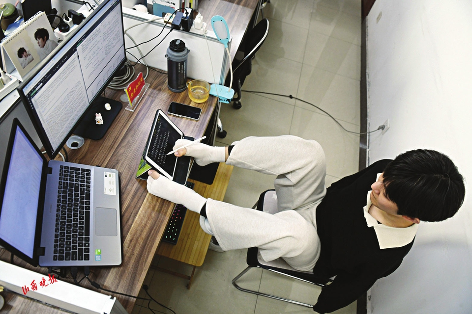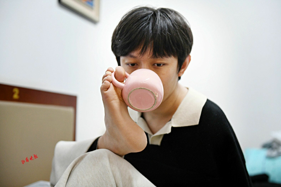 这份独立源于多年的磨砺与坚持。8岁触电失去双臂后,他在姐姐陪伴下从零开始练习用脚写字、吃饭、穿衣,每天反复练习,指尖磨出厚茧也未曾停歇。来到太原理工大学读研究生时,他毅然拒绝母亲陪读的要求,独自从山东来到山西办理报到手续。学校为他协调了配有独立卫生间的“阳光宿舍”,解决了上下床的难题,宿管阿姨郭慧萍起初常主动帮他收拾房间、准备热饭,但王海港始终坚持自己解决问题——他用滑板车推着水盆去洗衣房,用脚将衣服放进洗衣机;熟练用脚趾操作手机叫网约车、订高铁票,独自完成日常通勤与外出出行。“刚入学时他还需要我们搭把手,现在不仅能把自己打理得干干净净,宿舍也总是整整齐齐,做什么事都透着一股不服输的韧劲。”郭慧萍见证着他的蜕变。这份从“需要帮助”到“我可以”的转变,在他内心筑起坚实的自信堡垒。