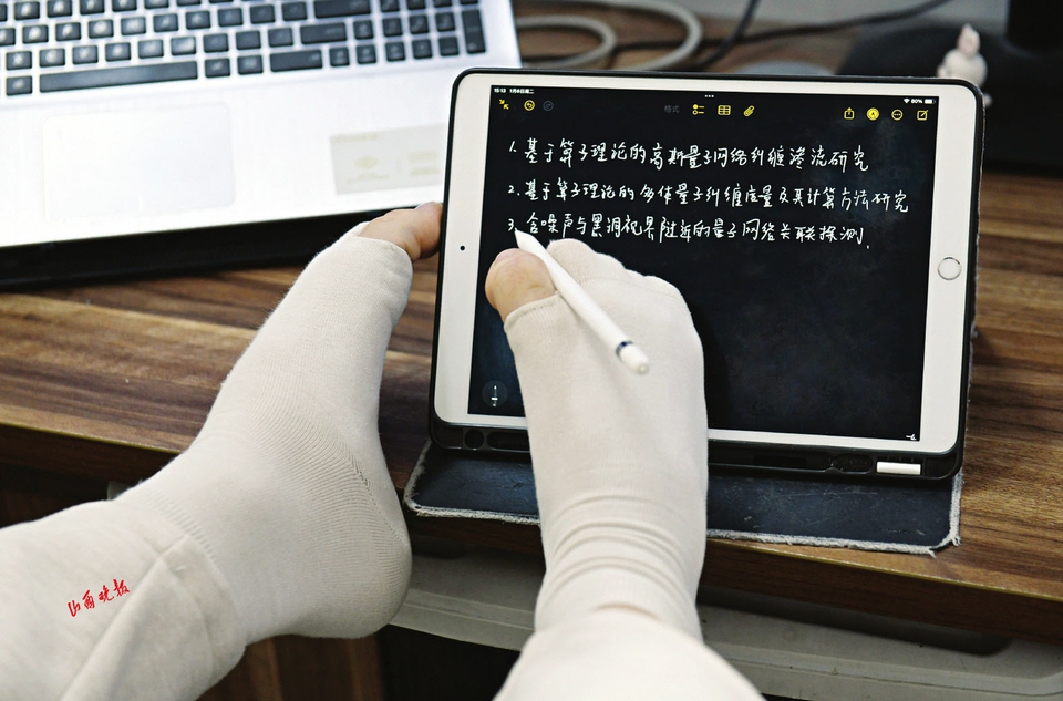 博三学生王海港正端坐电脑前,目光专注地凝视屏幕,脚趾灵活地在键盘上跳跃、在鼠标上挪动,一行行复杂的数学公式与量子仿真代码随之跃然屏上。