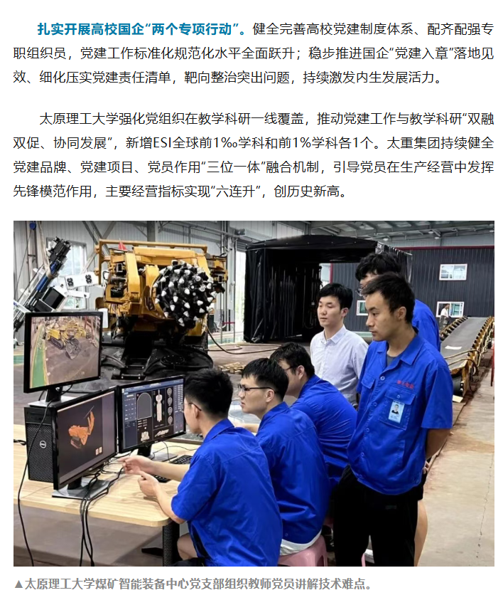 太原理工大学强化党组织在教学科研一线覆盖,推动党建工作与教学科研“双融双促、协同发展”,新增ESI全球前1‰学科和前1%学科各1个。太重集团持续健全党建品牌、党建项目、党员作用“三位一体”融合机制,引导党员在生产经营中发挥先锋模范作用,主要经营指标实现“六连升”,创历史新高。