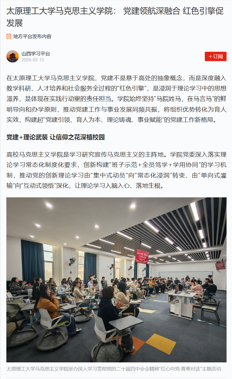 在太原理工大学马克思主义学院,党建不是悬于高处的抽象概念,而是深度融入教学科研、人才培养和社会服务全过程的“红色引擎”,是浸润于理论学习中的思想滋养,是体现在实践行动里的责任担当。学院始终坚持“马院姓马,在马言马”的鲜明导向和办学原则,推动党建工作与事业发展同频共振,将组织优势转化为育人实效,构建起“党建引领、育人为本、理论铸魂、事业赋能”的党建工作新格局。